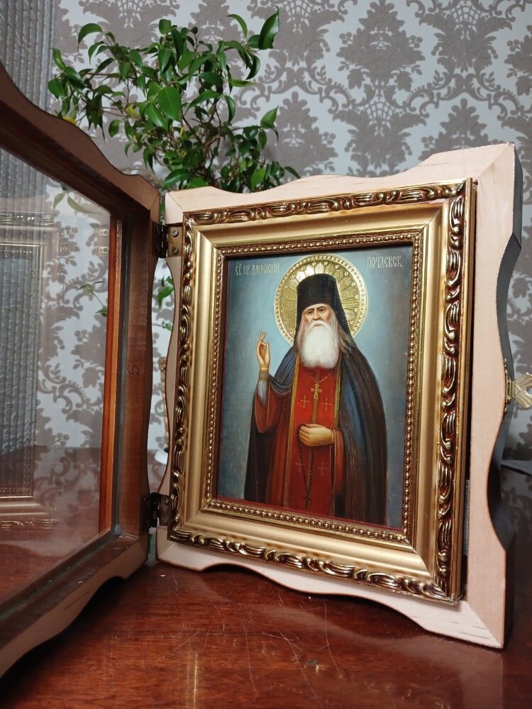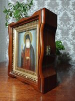Ікона виконана з липова дошка з дубовими шпонками, ікона написана на левкасі/ ікона написана олійними фарбами / німб ікони з сусального золота / ікона в кіоті / кіот з вільхи / ікона під склом