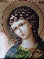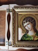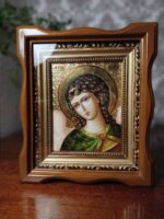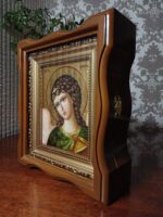 Ікона виконана з липова дошка з дубовими шпонками, ікона написана на левкасі/ ікона написана олійними фарбами / фон ікони з сусального золота / ікона оздоблена чеканим орнаментом / ікона в кіоті / кіот з вільхи / ікона під склом
