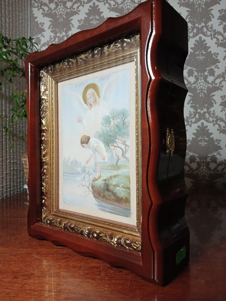 Ікона виконана з липова дошка з дубовими шпонками, ікона написана на левкасі/ ікона написана олійними фарбами / німб ікони з сусального золота / ікона в кіоті / кіот з вільхи / ікона під склом