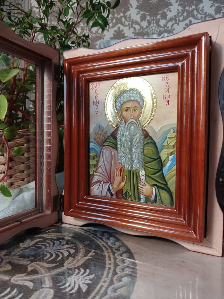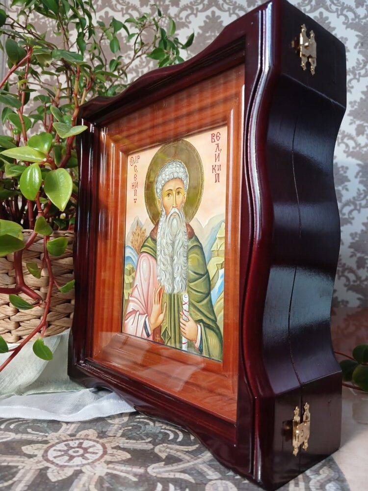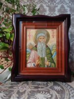 Ікона виконана з липова дошка з дубовими шпонками, ікона написана на левкасі/ ікона написана темперними фарбами / німб ікони з сусального золота / ікона в кіоті / кіот з вільхи / ікона під склом