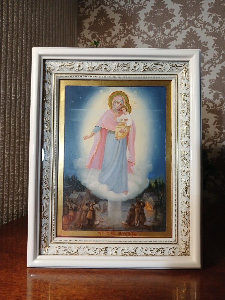 Ікона виконана з липова дошка з дубовими шпонками, ікона написана на левкасі/ ікона написана олійними фарбами / німб ікони з сусального золота / ікона в кіоті / кіот з вільхи / ікона під склом