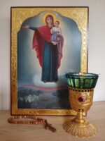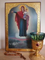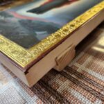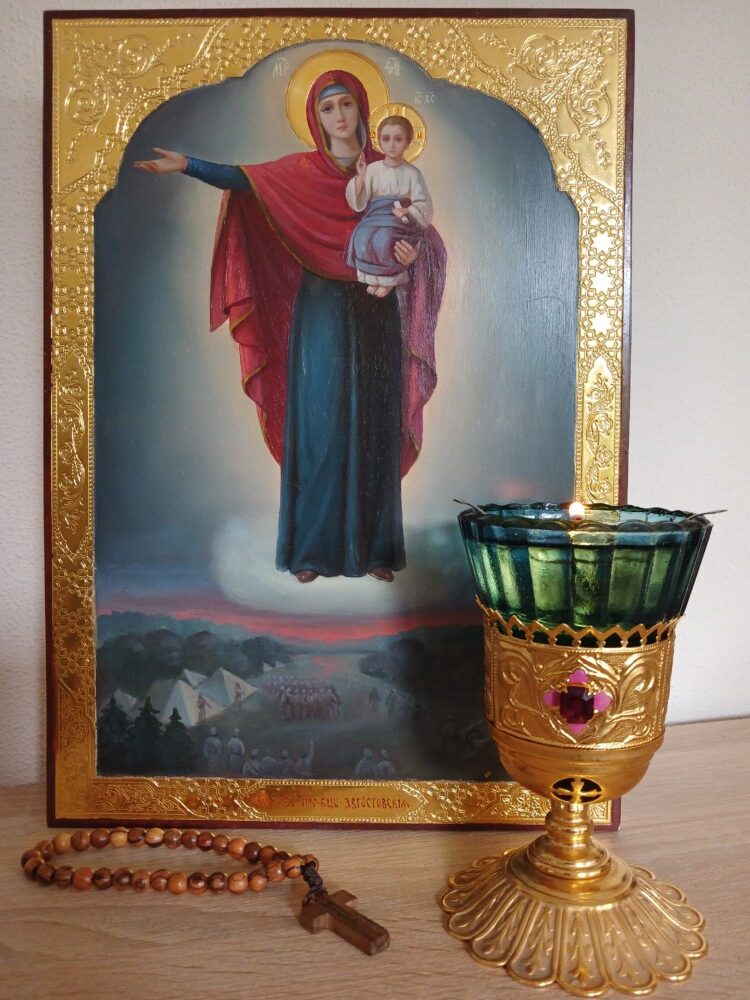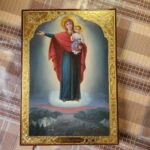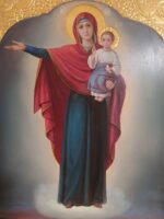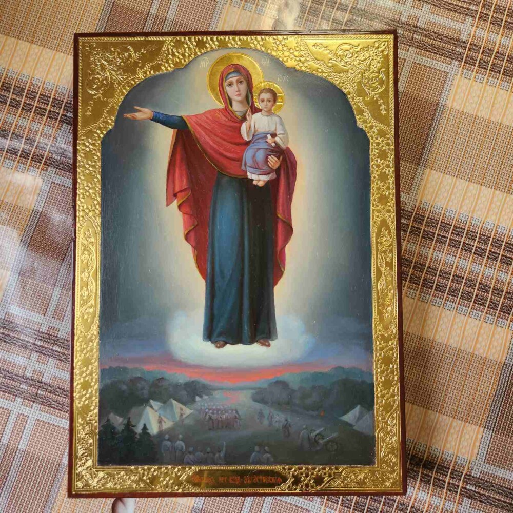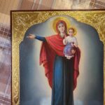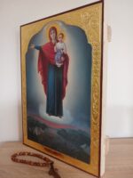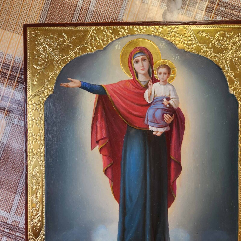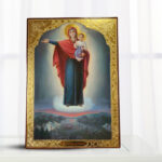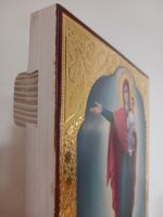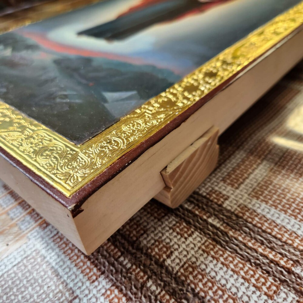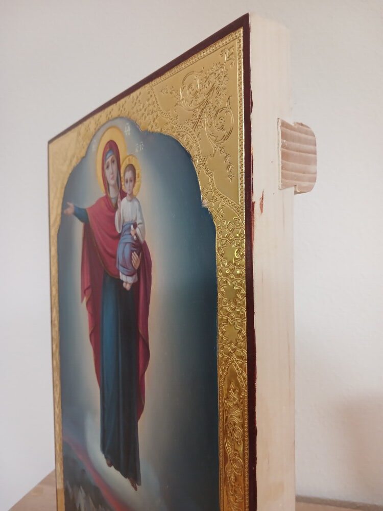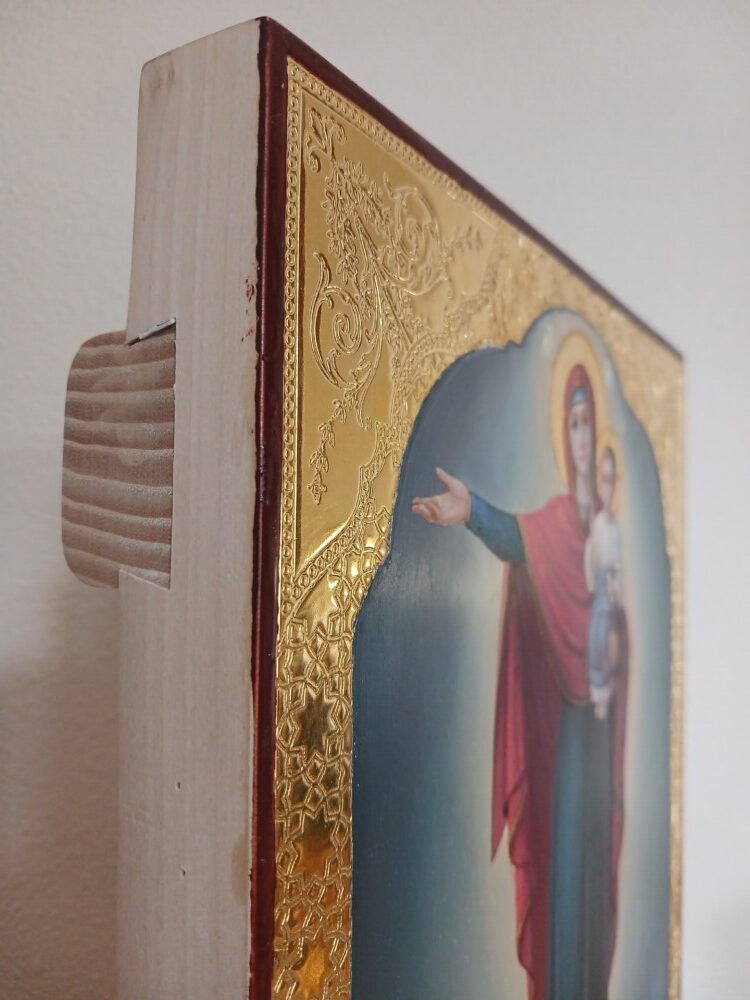 Ікона написана олійними фарбами на липовій дошці з дубовими шпонками, покритій левкасом. Розмір іконної дошки 25х35 см. Живопис захищений лаковим покриттям. Фон ікони із сусального золота з чеканним оздобленням.