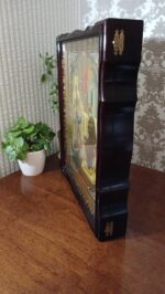 Ікона виконана з липова дошка з дубовими шпонками, ікона написана на левкасі/ ікона написана темперними фарбами / фон ікони з сусального золота / ікона оздоблена чеканим орнаментом з ємалевим покриттям / ікона в кіоті / кіот з вільхи / ікона під склом