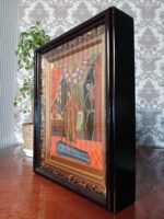 Ікона виконана з липова дошка з дубовими шпонками, ікона написана на левкасі/ ікона написана темперними фарбами / фон ікони з сусального золота / ікона оздоблена чеканим орнаментом / ікона в кіоті / кіот з вільхи / ікона під склом