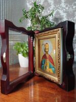 Ікона виконана з липова дошка з дубовими шпонками, ікона написана на левкасі/ ікона написана темперними фарбами / фон ікони з сусального золота / ікона оздоблена чеканим орнаментом / ікона в кіоті / кіот з вільхи / ікона під склом
