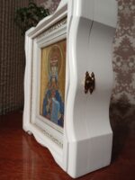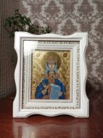 Ікона виконана з липова дошка з дубовими шпонками, ікона написана на левкасі/ ікона написана темперними фарбами / фон ікони з сусального золота / ікона оздоблена чеканим орнаментом / ікона в кіоті / кіот з вільхи / ікона під склом