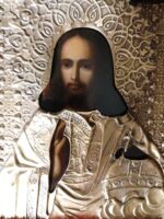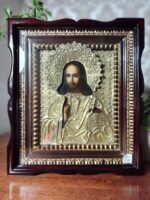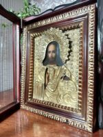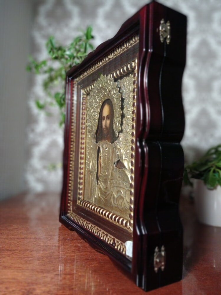 Ікона написана на дошці / ікона написана олійними фарбами / ікона оздоблена латунною ризою з позолотою / ікона в кіоті / кіот з вільхи / ікона під склом