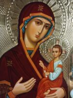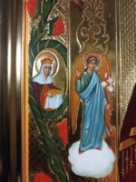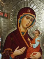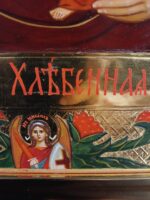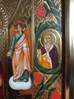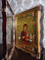 Ікона виконана з липова дошка з дубовими шпонками, ікона написана на левкасі/ ікона написана темперними фарбами / фон ікони з сусального золота / ікона оздоблена чеканим орнаментом з ємалевим покриттям / ікона в кіоті / кіот з вільхи / ікона під склом