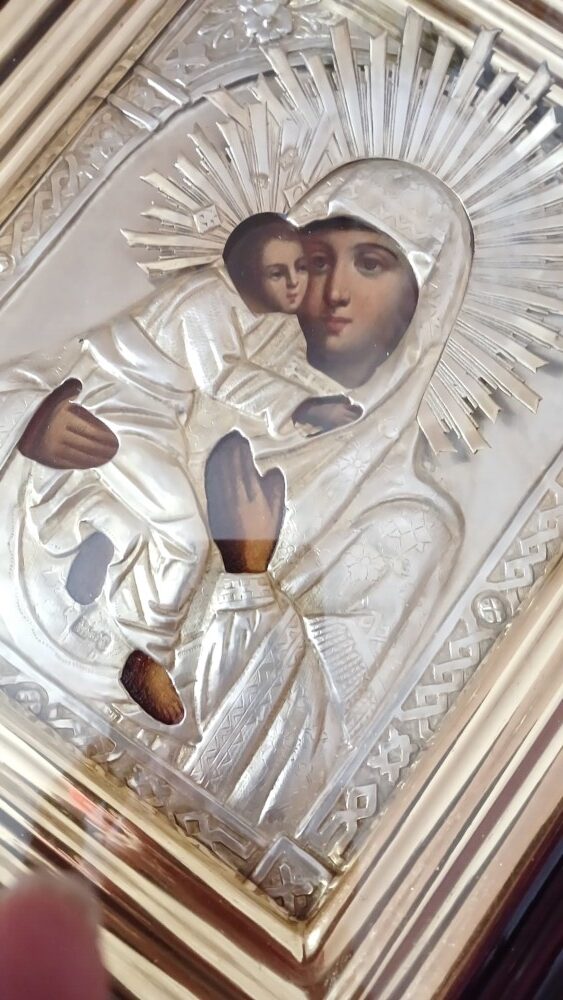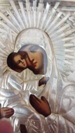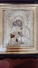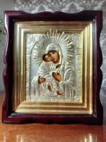 Ікона написана на дошці / ікона написана олійними фарбами / ікона оздоблена срібною чеканою ризою 925 проби / ікона в кіоті / рамка кіота покрита сусальним золотом / ікона під склом