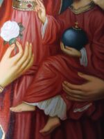 Ікона виконана з липова дошка з дубовими шпонками, ікона написана на левкасі/ ікона написана олійними фарбами / фон ікони з сусального золота / ікона оздоблена чеканим орнаментом / ікона в кіоті / кіот з вільхи / ікона під склом