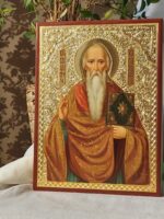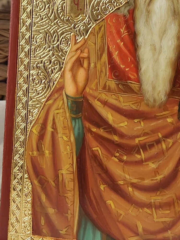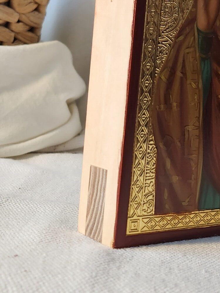 Ікона виконана на липовій дошці з дубовими шпонками, ікона написана на левкасі олійними фарбами / фон ікони з сусального золота оздоблений чеканним орнаментом. Лакове покриття.