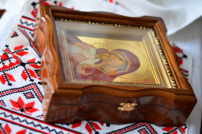 Ікона – липова дошка, дубові шпонки, левкас, олійні фарби, сусальне золото, лакове покриття, кіот, який відкривається.