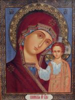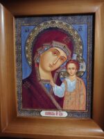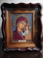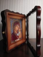 Ікона у фігурному відкривному кіоті із ясеневої деревини під склом.