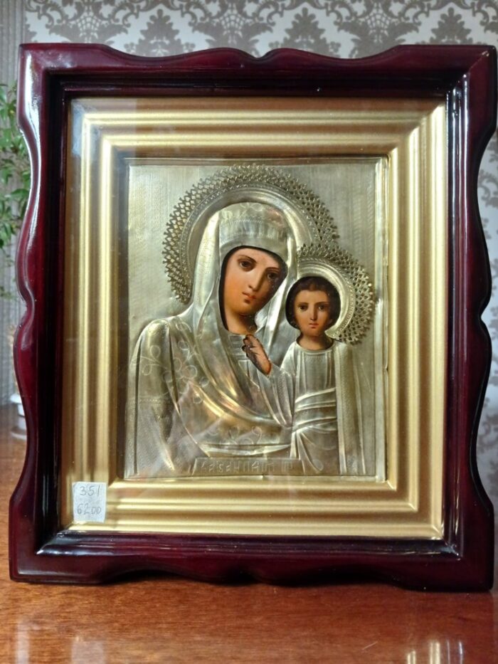 Ікона написана на дошці / ікона написана олійними фарбами / ікона оздоблена чеканою ризою / ікона в кіоті / кіот з вільхи / ікона під склом