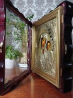 Ікона написана на дошці / ікона написана олійними фарбами /ікона оздоблена латунною ризою з позолотою/ ікона в кіоті / кіот з вільхи / ікона під склом