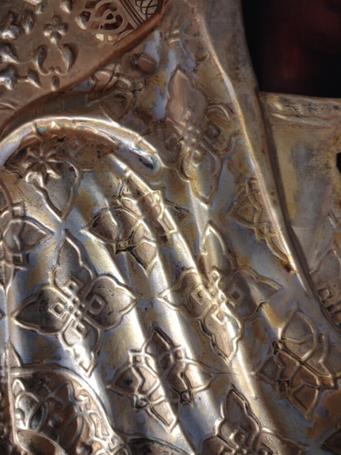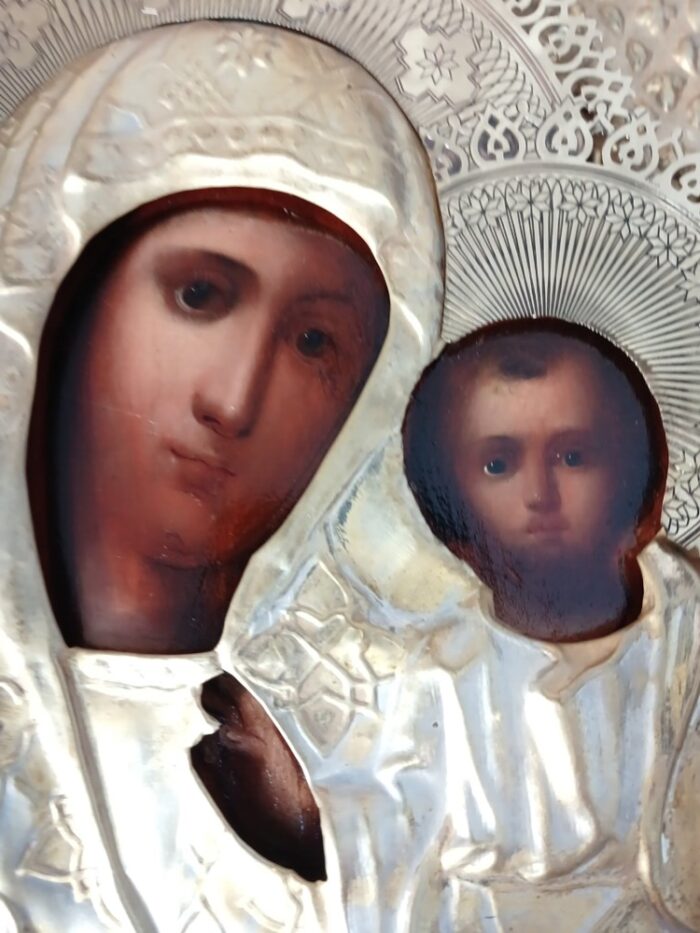 Ікона написана на дошці / ікона написана олійними фарбами / ікона оздоблена чеканою ризою з позолотою / ікона в кіоті / кіот з вільхи / ікона під склом