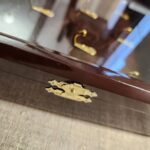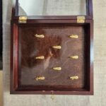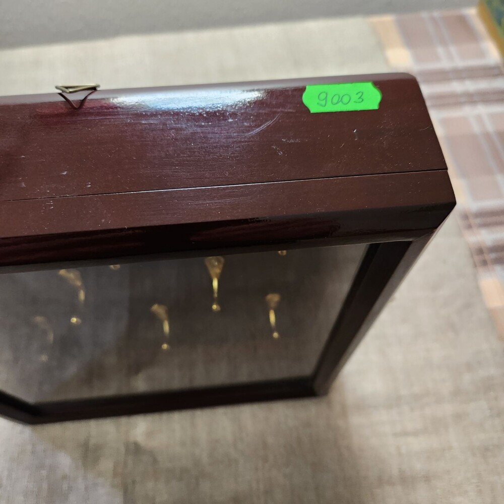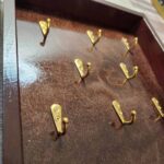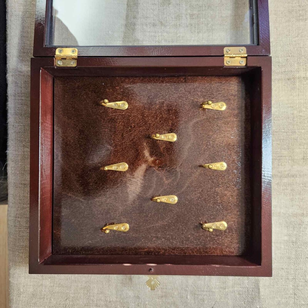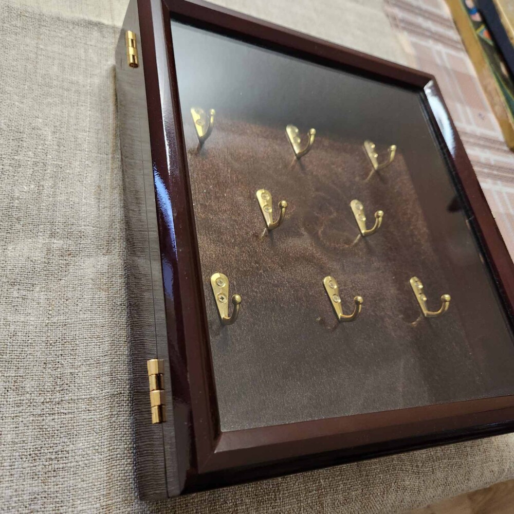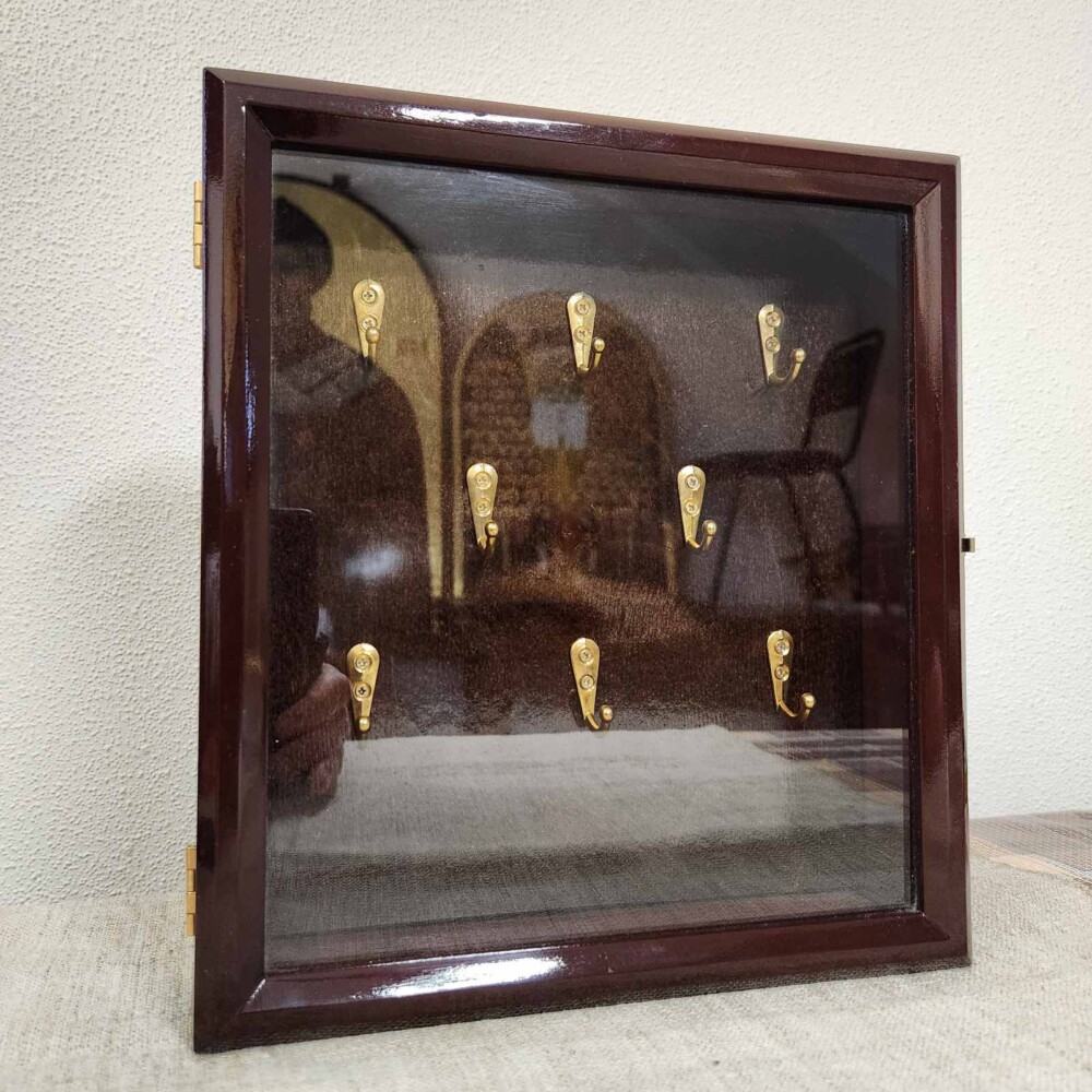 Ключниця виготовлена із букової деревини. Гачки для ключів розміщені у три ряди у шаховому порядку. Кількість гачків: 8 штук.