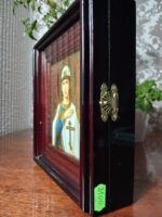 Ікона виконана з липова дошка з дубовими шпонками, ікона написана на левкасі/ ікона написана олійними фарбами / фон ікони з сусального золота / ікона оздоблена чеканим орнаментом / ікона в кіоті / кіот з вільхи / ікона під склом