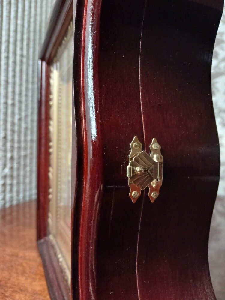 Ікона виконана з липова дошка з дубовими шпонками, ікона написана на левкасі/ ікона написана темперними фарбами / фон ікони з сусального золота / ікона оздоблена чеканим орнаментом / ікона в кіоті / кіот з вільхи / ікона під склом