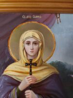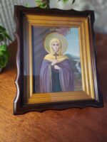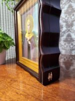 Ікона виконана з липова дошка з дубовими шпонками, ікона написана на левкасі/ ікона написана олійними фарбами / німб ікони з сусального золота / ікона оздоблена чеканим орнаментом / ікона в кіоті / кіот з вільхи / ікона під склом