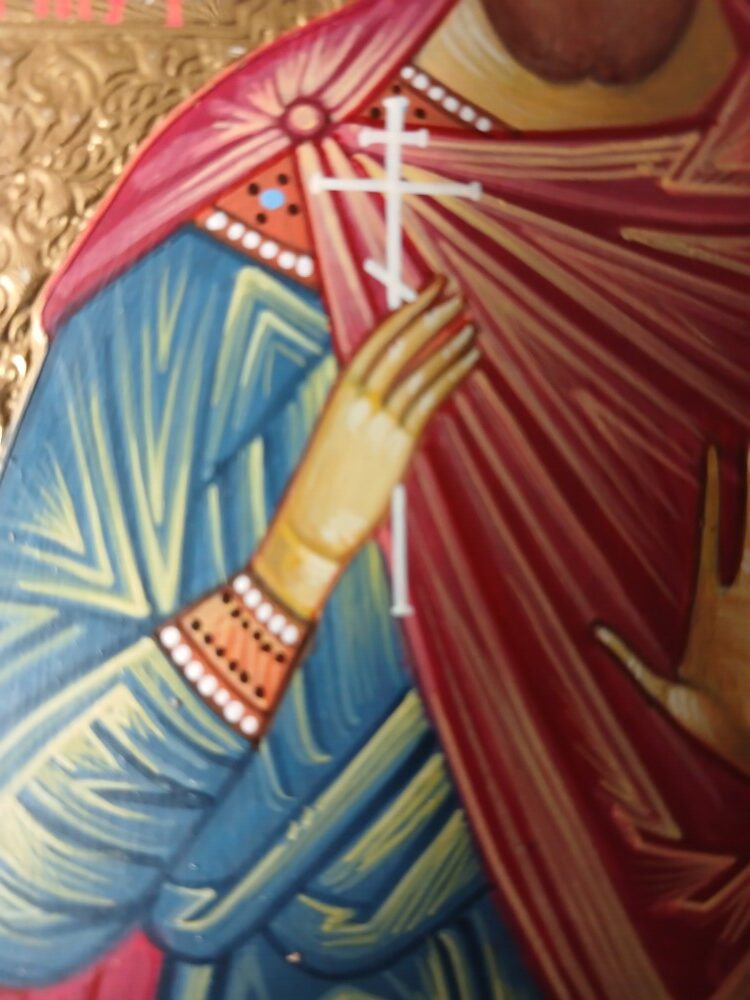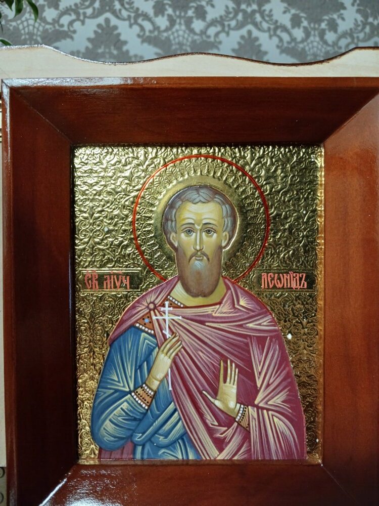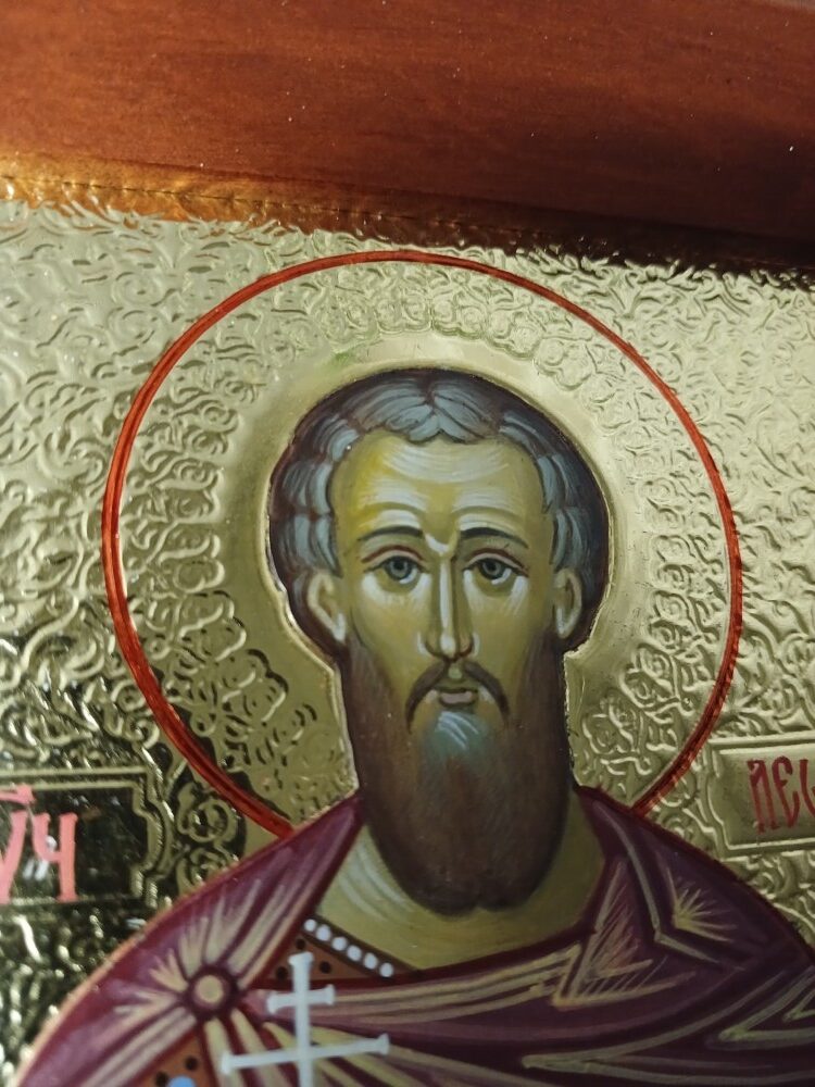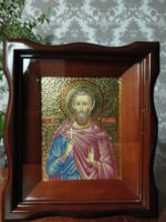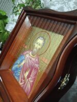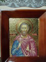 Ікона виконана з липова дошка з дубовими шпонками, ікона написана на левкасі/ ікона написана темперними фарбами / фон ікони з сусального золота / ікона оздоблена чеканим орнаментом/ ікона в кіоті / кіот з вільхи / ікона під склом