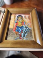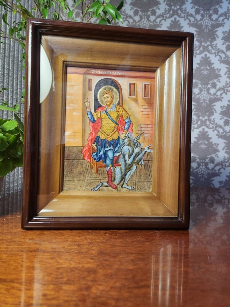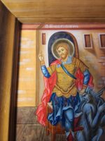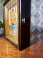 Ікона виконана на липовій дошці з дубовими шпонками, ікона написана на левкасі/ ікона написана темперними фарбами / німб ікони із сусального золота / ікона в кіоті / кіот з вільхи / ікона під склом