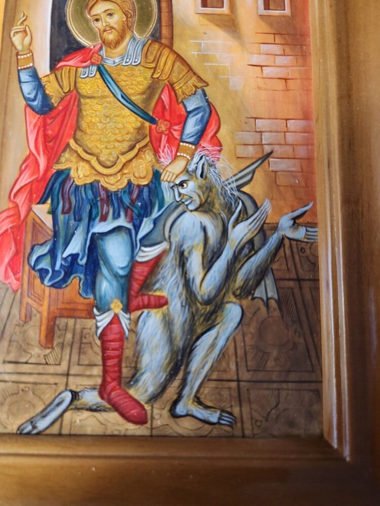 зображують у буквальному сенсі фізично перемагаючим диявола?