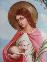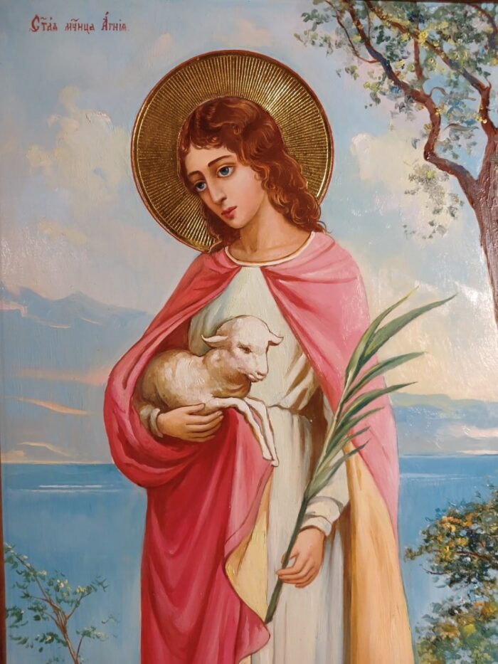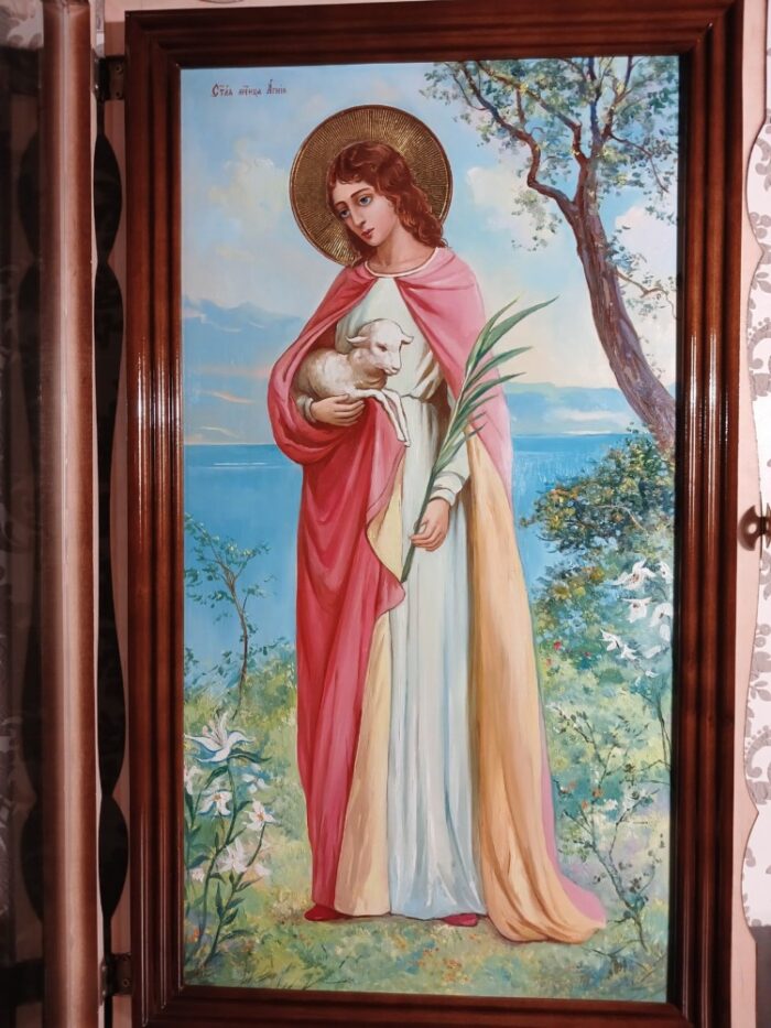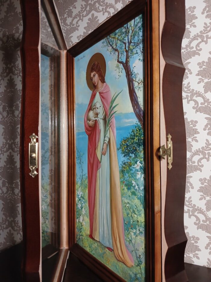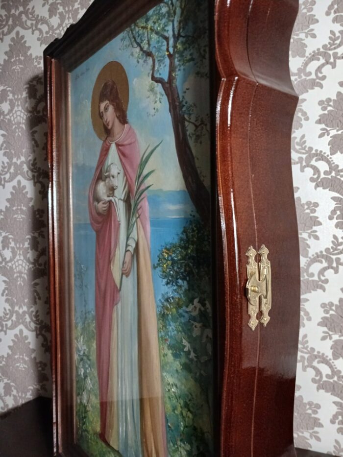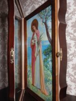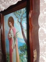 Ікона виконана з липова дошка з дубовими шпонками, ікона написана на левкасі/ ікона написана темперними фарбами / німб святої на іконі з сусального золота / ікона в кіоті / кіот з вільхи / ікона під склом