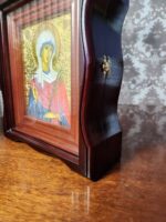 Ікона виконана з липова дошка з дубовими шпонками, ікона написана на левкасі/ ікона написана темперними фарбами / фон ікони з сусального золота / ікона оздоблена чеканим орнаментом / ікона в кіоті / кіот з вільхи / ікона під склом