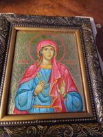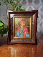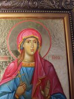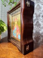 Ікона виконана з липова дошка з дубовими шпонками, ікона написана на левкасі/ ікона написана темперними фарбами / фон ікони з сусального золота / ікона оздоблена чеканим орнаментом / ікона в кіоті / кіот з вільхи / ікона під склом