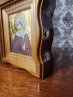 Ікона виконана з липова дошка з дубовими шпонками, ікона написана на левкасі/ ікона написана темперними фарбами / фон ікони з сусального золота / ікона оздоблена чеканим орнаментом / ікона в кіоті / кіот з вільхи / ікона під склом