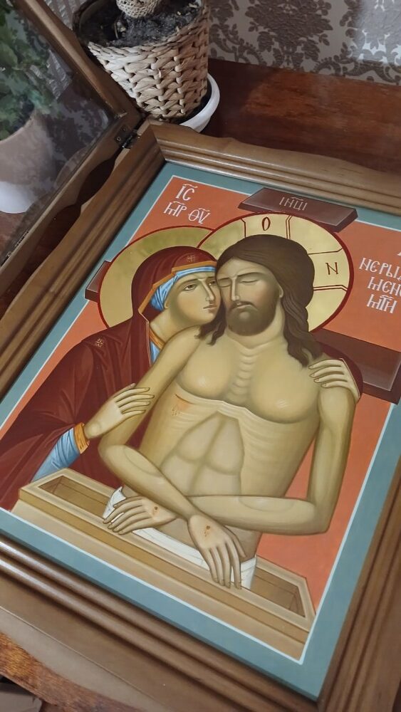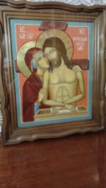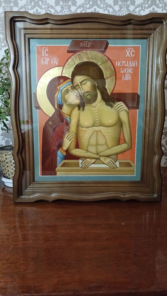 Ікона виконана з липова дошка з дубовими шпонками, ікона написана на левкасі/ ікона написана темперними фарбами / німб ікони з сусального золота / ікона в кіоті / кіот з вільхи / ікона під склом