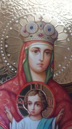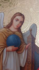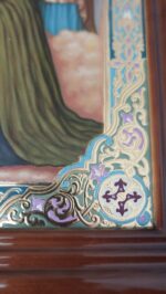 Ікона виконана з липова дошка з дубовими шпонками, ікона написана на левкасі/ ікона написана олійними фарбами / фон ікони з сусального золота / ікона оздоблена чеканим орнаментом з ємалевим покриттям / ікона в кіоті / кіот з вільхи / ікона під склом