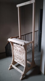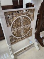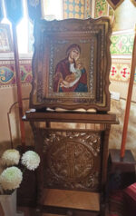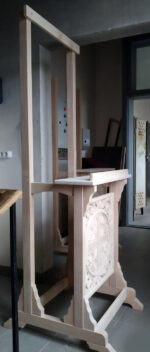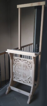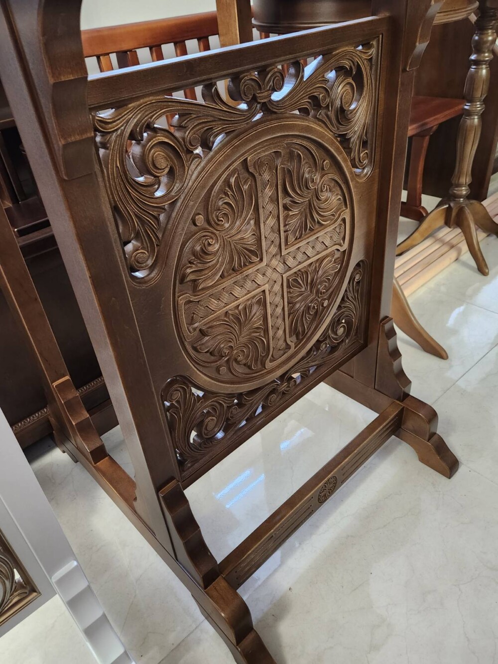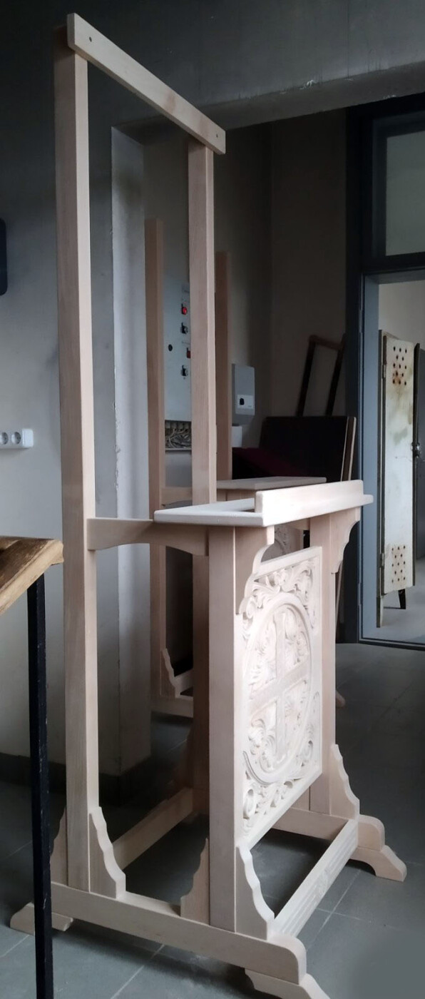 Підставка для великої ікони, прикрашена різьбою ручної роботи. Використовується у храмі.