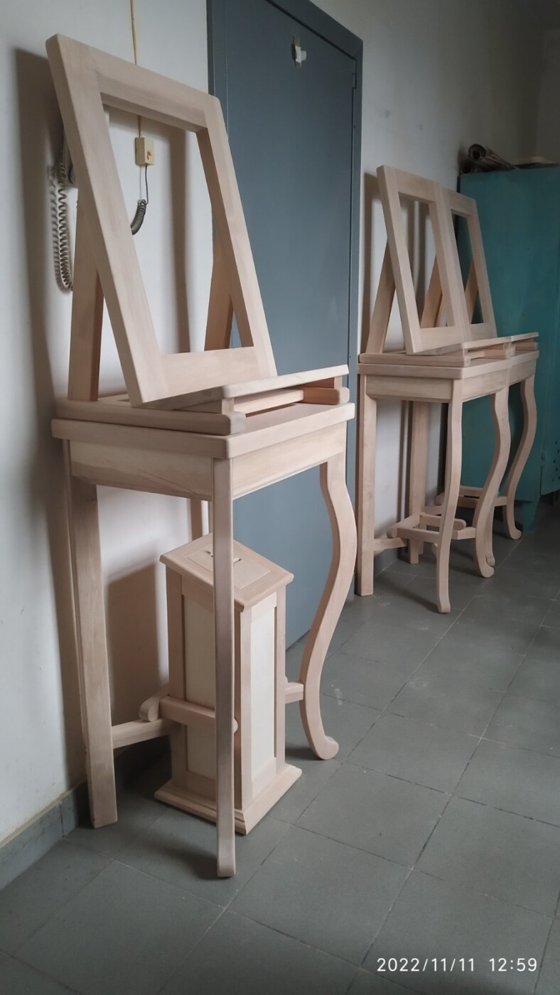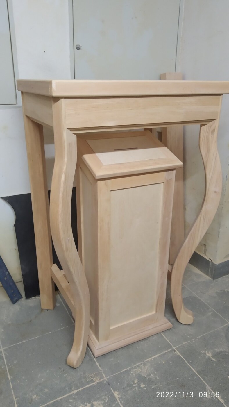 Підставка для великої ікони, на чотирьох фігурних ніжках, з карнавкою для милостині. Використовується у храмі.
