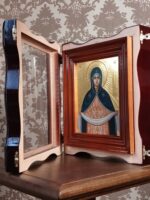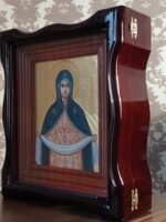 Ікона виконана з липова дошка з дубовими шпонками, ікона написана на левкасі/ ікона написана олійними фарбами / фон ікони з сусального золота / ікона оздоблена чеканим орнаментом / ікона в кіоті / кіот з вільхи / ікона під склом