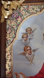 Ікона виконана з липова дошка з дубовими шпонками, ікона написана на левкасі/ ікона написана олійними фарбами / фон ікони з сусального золота / ікона оздоблена чеканим орнаментом з ємалевим покриттям / ікона в кіоті / кіот з вільхи / ікона під склом