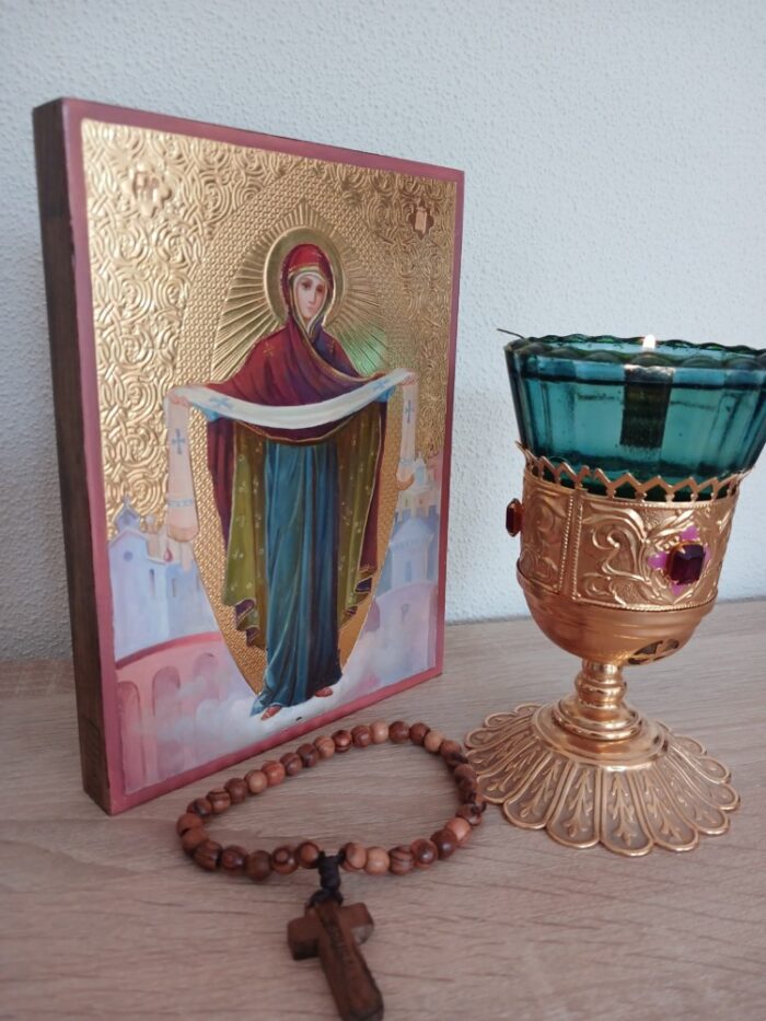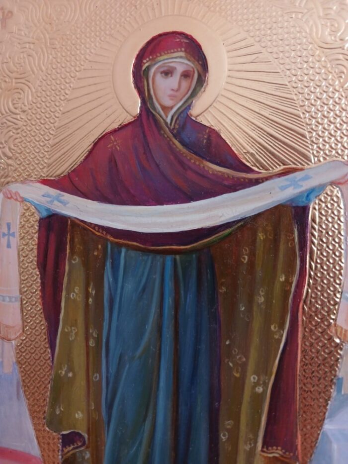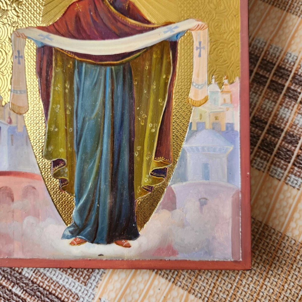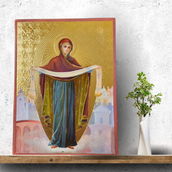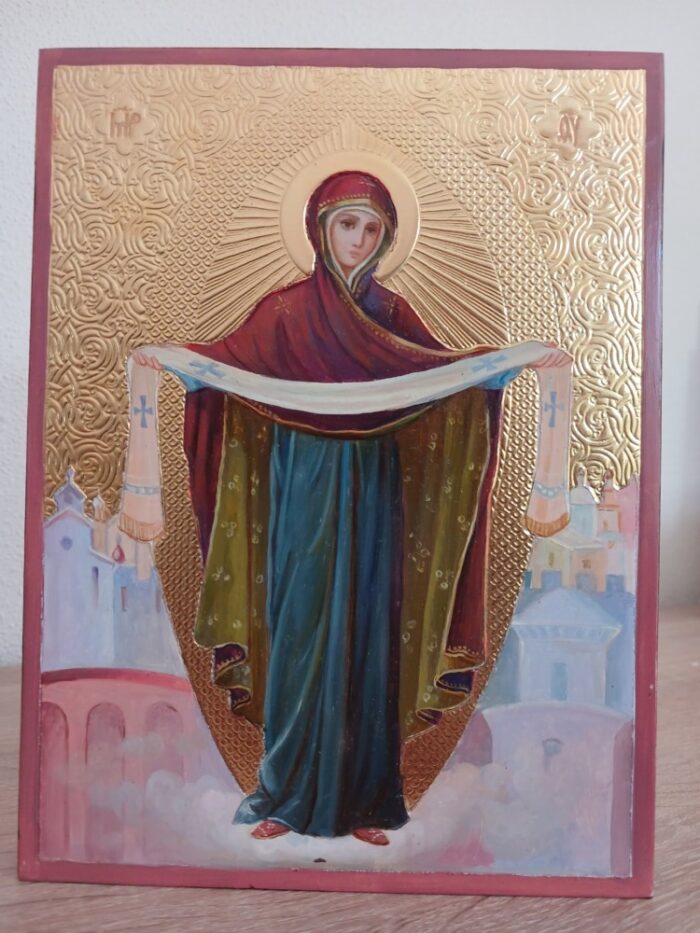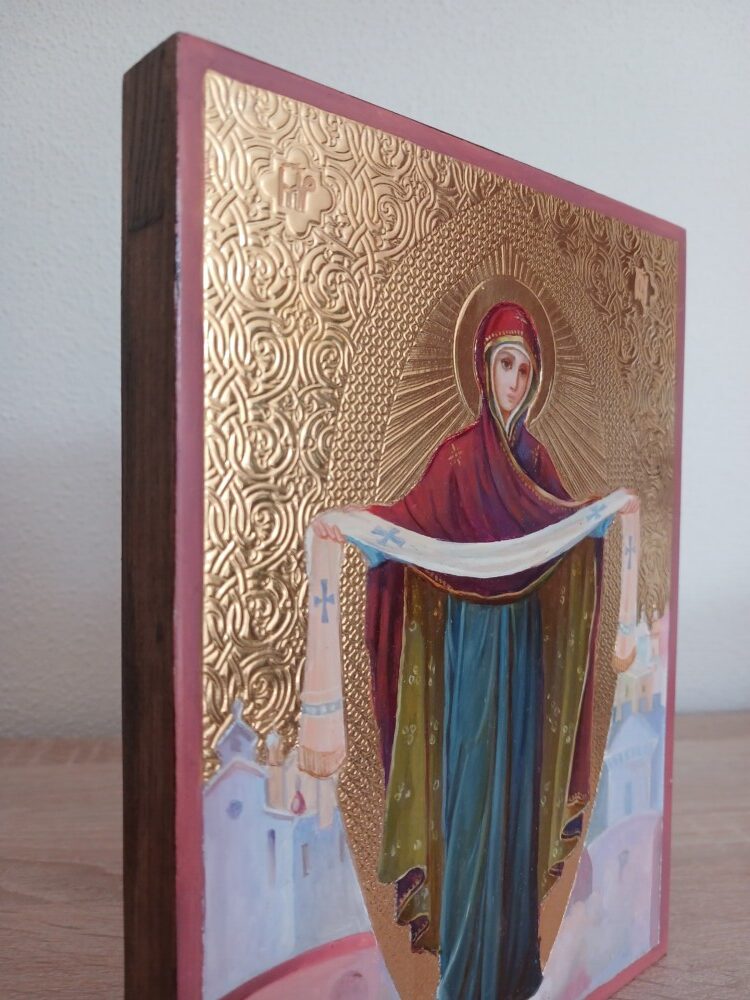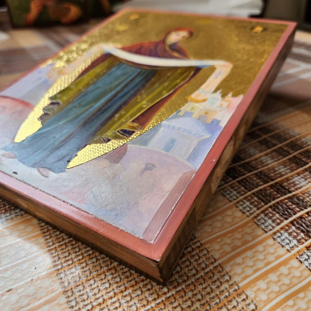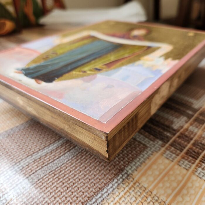 Ікона написана олійними фарбами на липовій дошці з дубовими шпонками, покритій левкасом. Живопис захищений лаковим покриттям. Фон ікони із сусального золота з чеканним оздобленням.