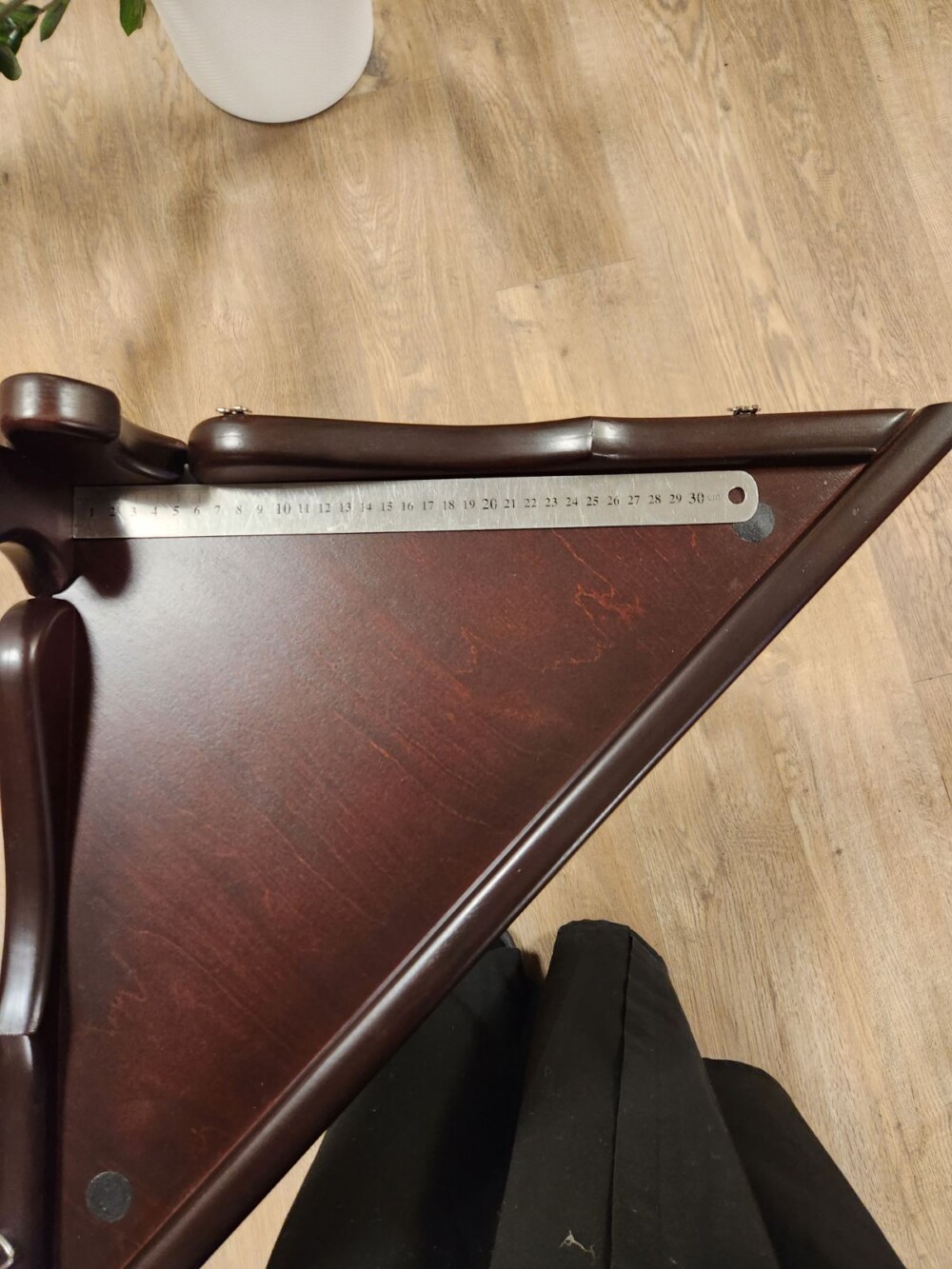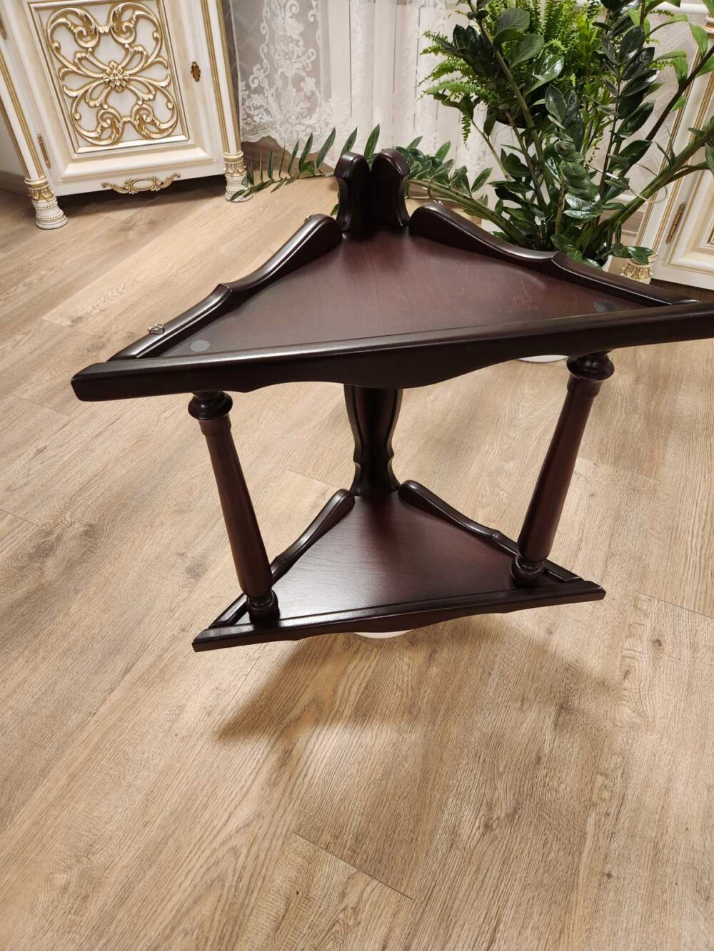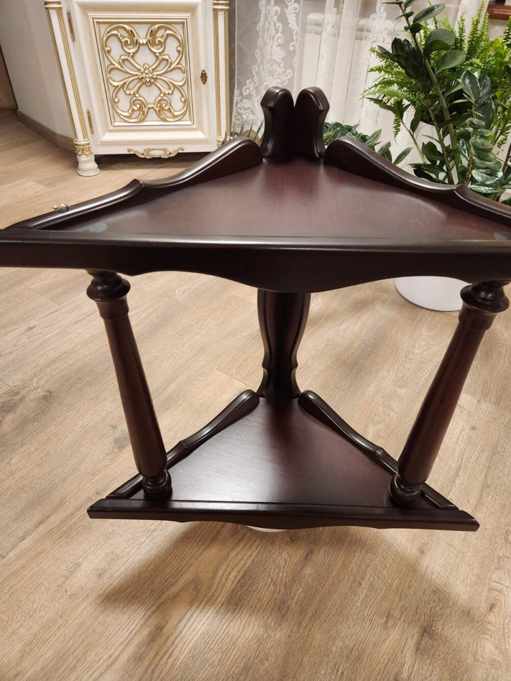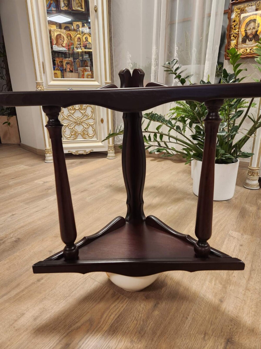 Полиця для ікон кутова двоярусна на тонких різьбленних колонах, з фігурними бортиками, виготовлена із ясеневої деревини. Є різні варіанти вибору тонування під лак.