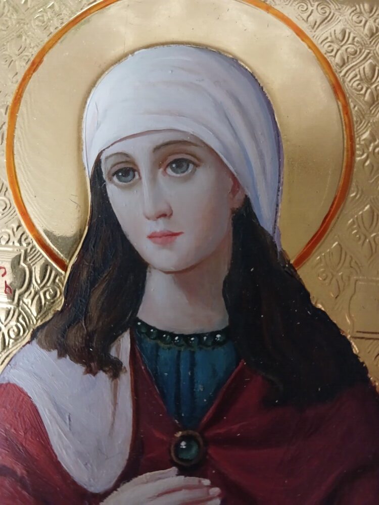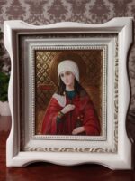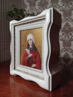 Ікона виконана з липова дошка з дубовими шпонками, ікона написана на левкасі/ ікона написана олійними фарбами / фон ікони з сусального золота / ікона оздоблена чеканим орнаментом / ікона в кіоті / кіот з вільхи / ікона під склом