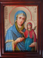 Ікона виконана з липова дошка з дубовими шпонками, ікона написана на левкасі/ ікона написана олійними фарбами / фон ікони з сусального золота / ікона оздоблена чеканим орнаментом / ікона в кіоті / кіот з вільхи / ікона під склом