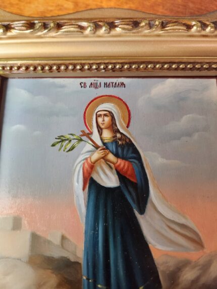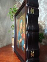 Ікона виконана з липова дошка з дубовими шпонками, ікона написана на левкасі/ ікона написана олійними фарбами / фон ікони з сусального золота / ікона оздоблена чеканим орнаментом з ємалевим покриттям / ікона в кіоті / кіот з вільхи / ікона під склом