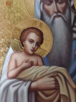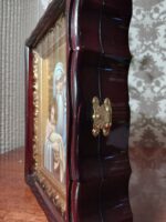 Ікона виконана з липова дошка з дубовими шпонками, ікона написана на левкасі/ ікона написана темперними фарбами / фон ікони з сусального золота / ікона оздоблена чеканим орнаментом / ікона в кіоті / кіот з вільхи / ікона під склом