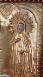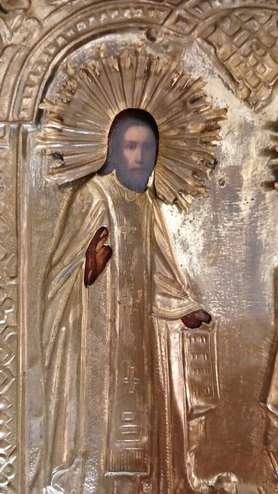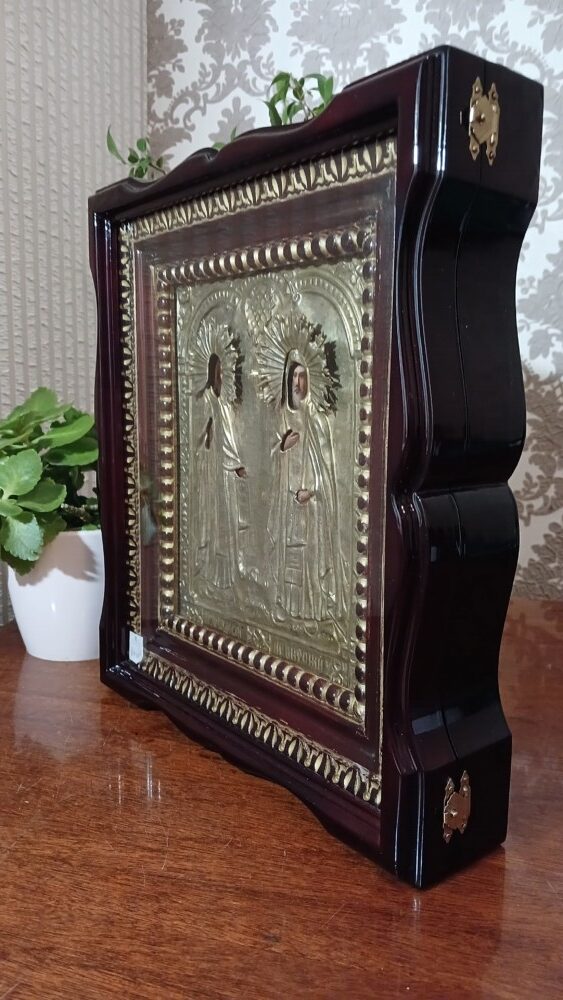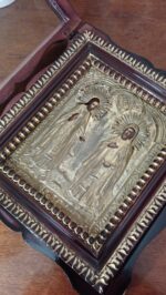 Ікона написана на дошці / ікона написана олійними фарбами / ікона оздоблена чеканою ризою с накладними німбами / ікона в кіоті / рамка в кіоті оздоблена різбленими косічками / ікона під склом