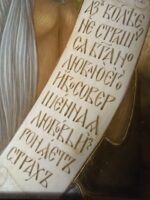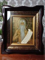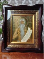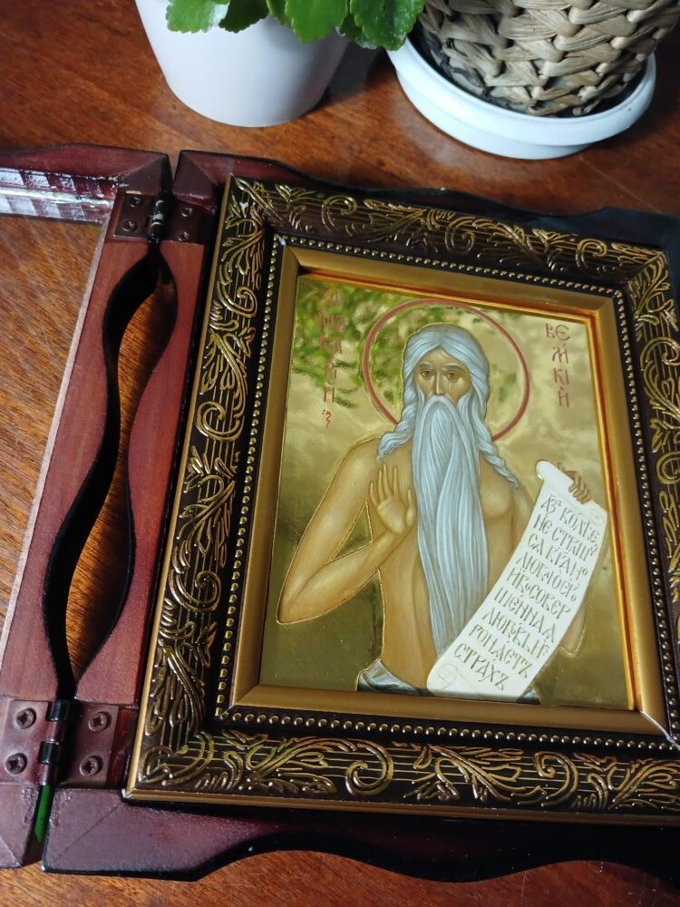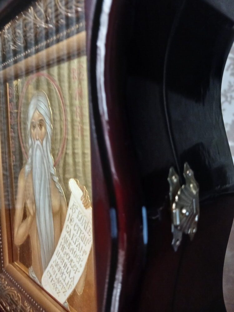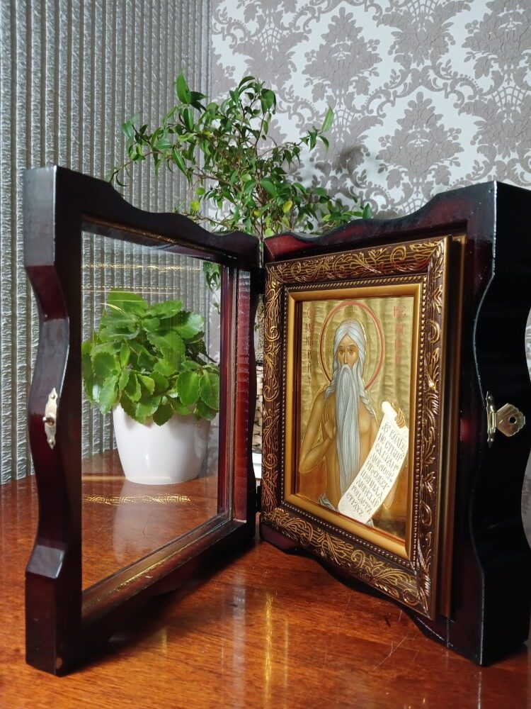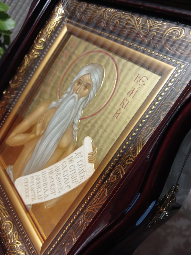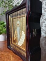 Ікона виконана з липова дошка з дубовими шпонками, ікона написана на левкасі/ ікона написана темперними фарбами / фон ікони з сусального золота / ікона в кіоті / кіот з вільхи / ікона під склом