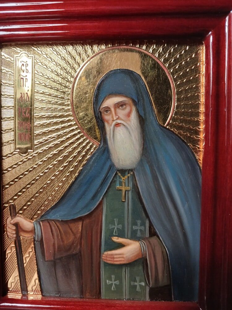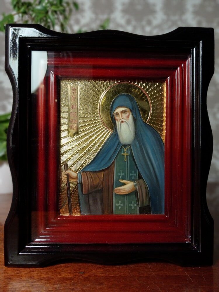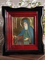Ікона виконана з липова дошка з дубовими шпонками, ікона написана на левкасі/ ікона написана олійними фарбами / фон ікони з сусального золота / ікона оздоблена чеканим орнаментом / ікона в кіоті / кіот з вільхи / ікона під склом