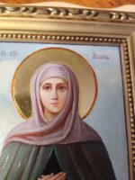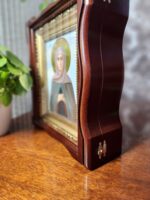 Ікона виконана з липова дошка з дубовими шпонками, ікона написана на левкасі/ ікона написана олійними фарбами / німб ікони з сусального золота / ікона оздоблена чеканим орнаментом з ємалевим покриттям / ікона в кіоті / кіот з вільхи / ікона під склом