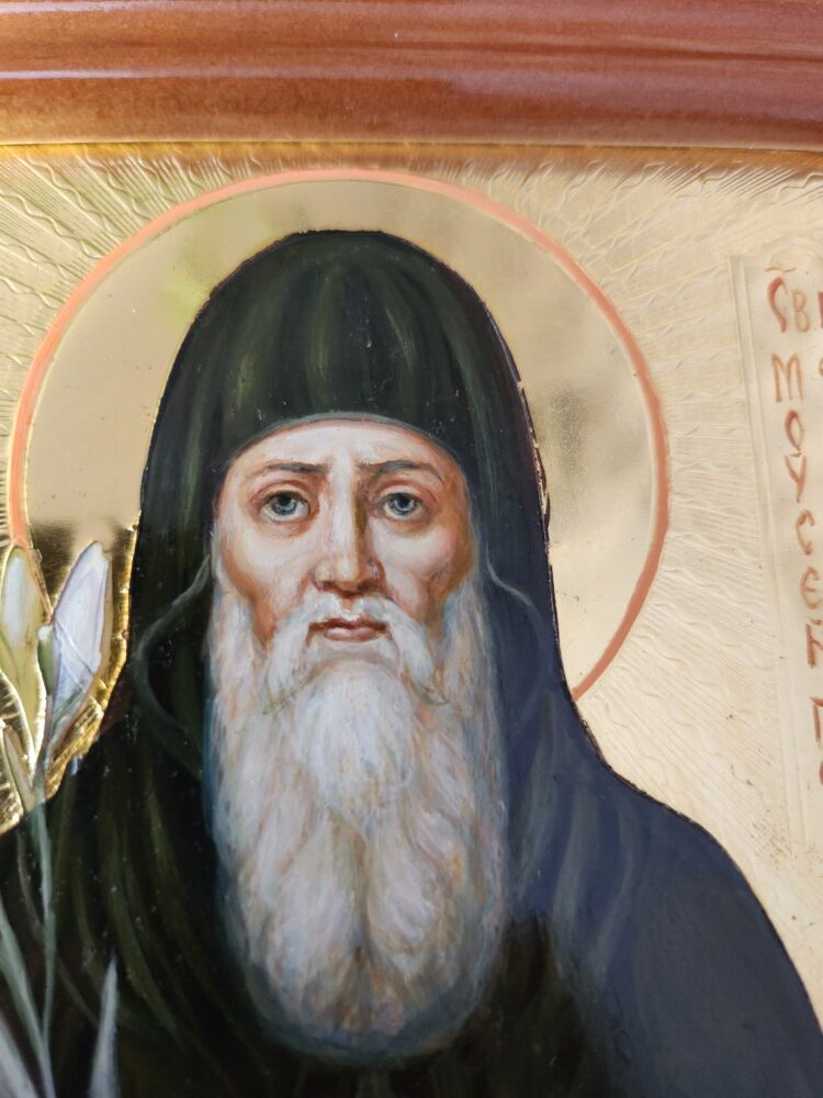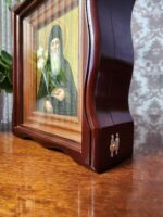 Ікона виконана з липова дошка з дубовими шпонками, ікона написана на левкасі/ ікона написана олійними фарбами / фон ікони з сусального золота / ікона оздоблена чеканим орнаментом / ікона в кіоті / кіот з вільхи / ікона під склом