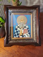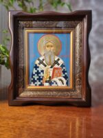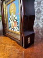 Ікона виконана з липова дошка з дубовими шпонками, ікона написана на левкасі/ ікона написана темперними фарбами / фон ікони з сусального золота / ікона оздоблена чеканим орнаментом / ікона в кіоті / кіот з вільхи / ікона під склом