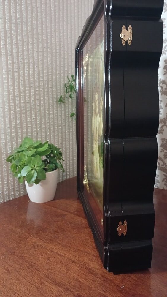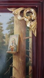 Ікона виконана з липова дошка з дубовими шпонками, ікона написана на левкасі/ ікона написана олійними фарбами / фон ікони з сусального золота / ікона оздоблена чеканим орнаментом з ємалевим покриттям / ікона в кіоті / кіот з вільхи / ікона під склом